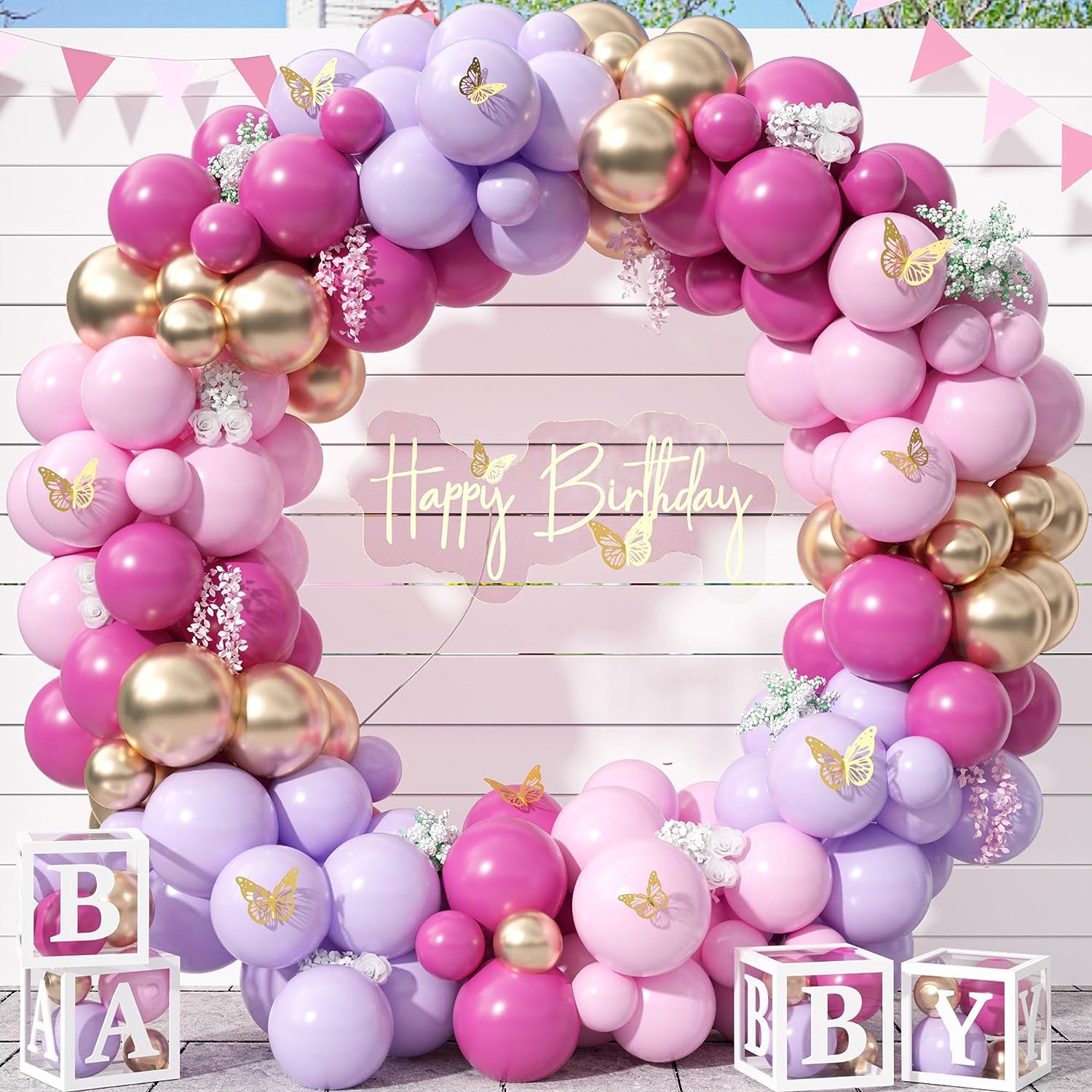 Balloon Garland Kit- purple rose and gold balloons with golden small butterflies